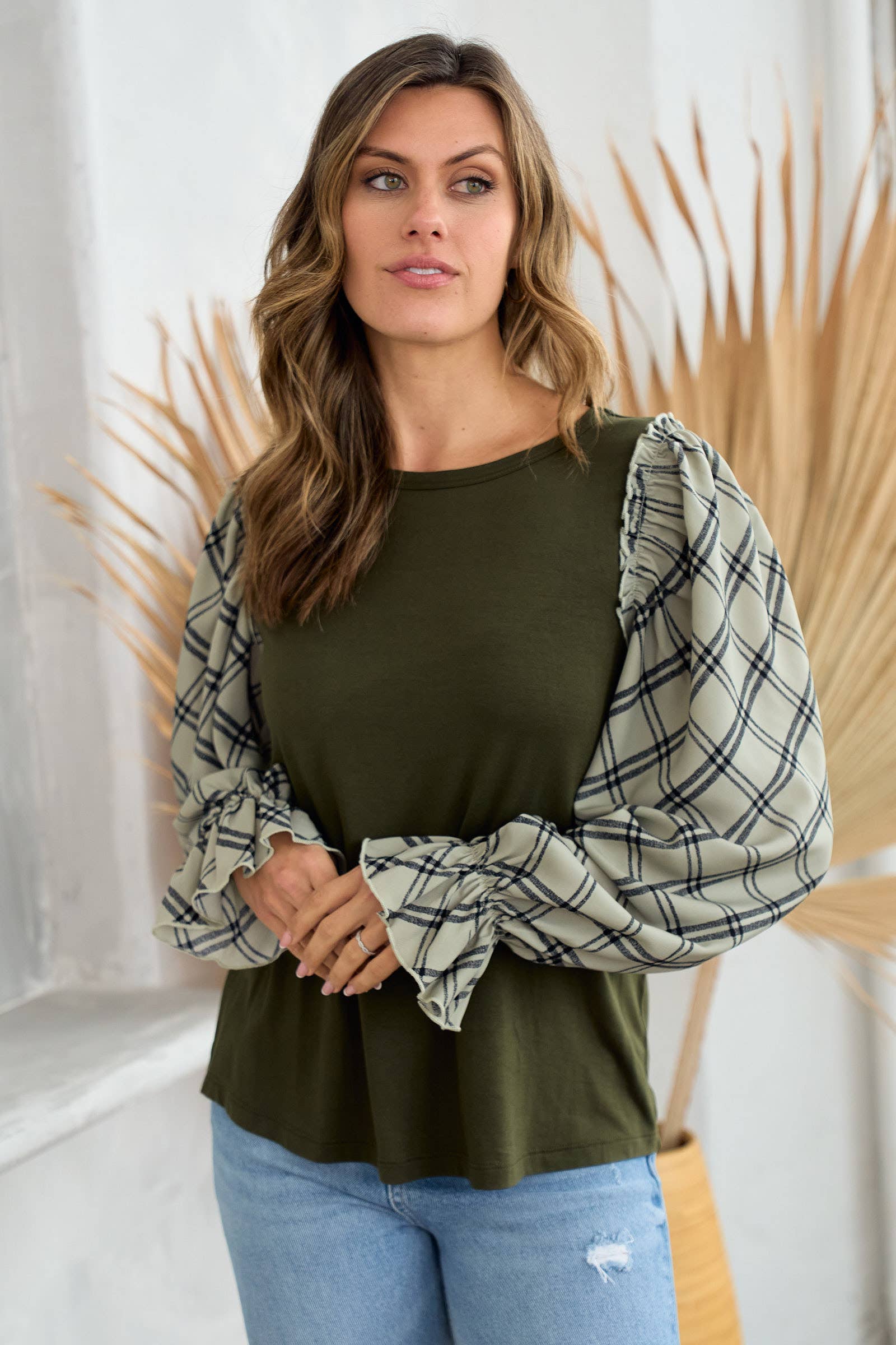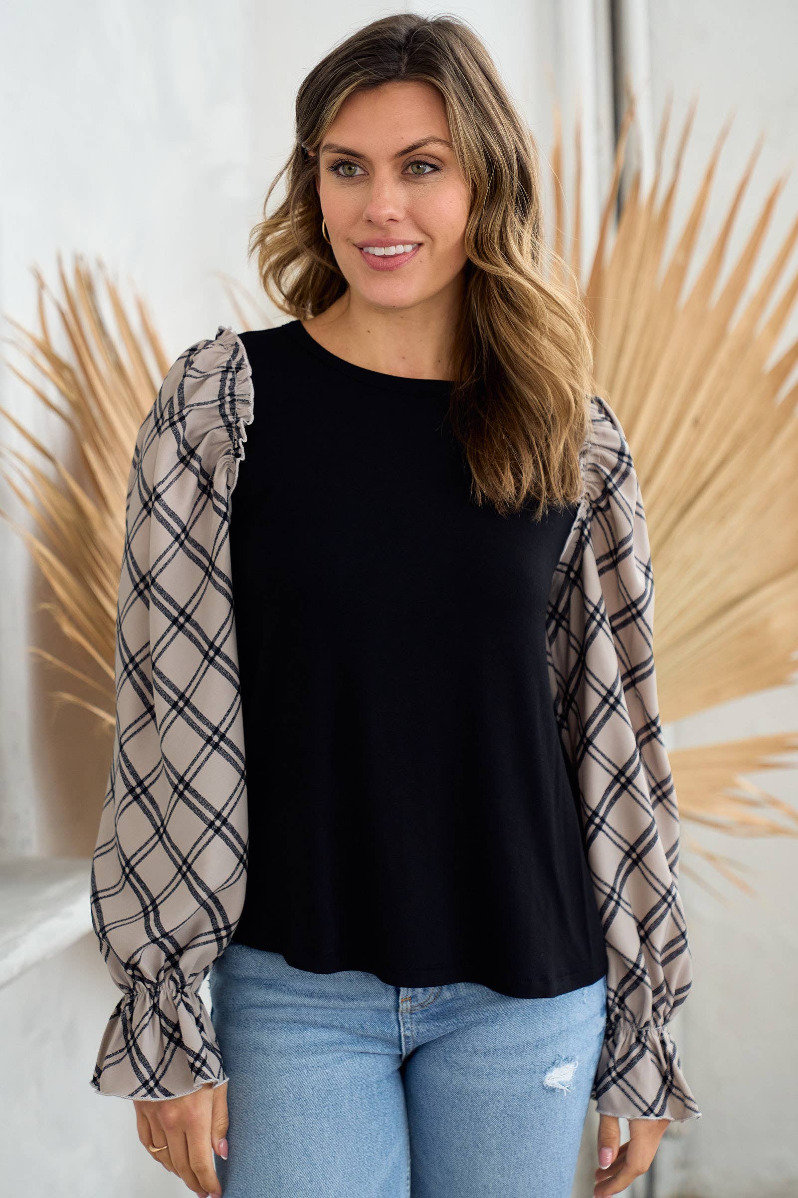 Plus jersey top with woven contrast check print-PLT10510